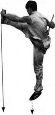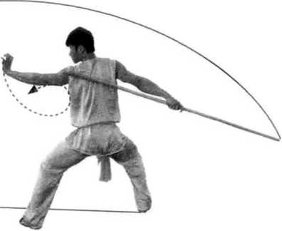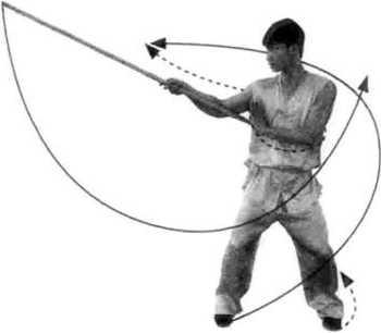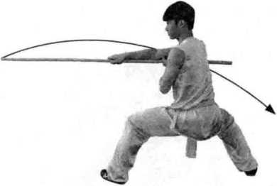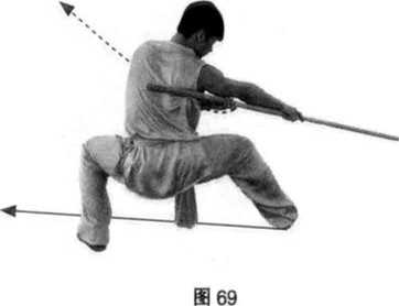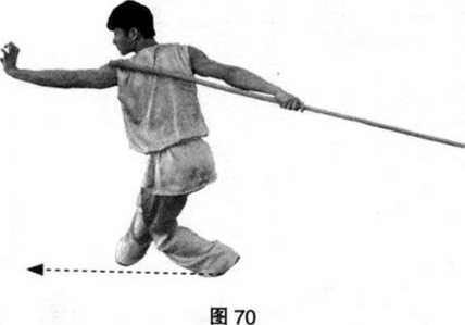 (2)上体微右转;同时,两手握棍使棍梢由左 侧向右下拨棍;目视棍梢。(图69)