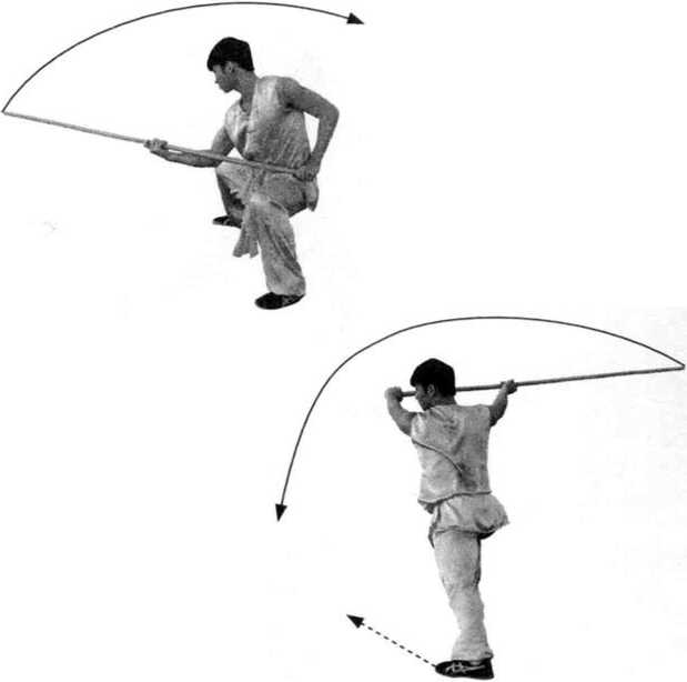 踏步沉稳有 力,弓步拧腰、 转胯、蹬腿与斜 后挂棍协调一致; 斜后挂棍时腰为 轴,左右抖动助 力,力达棍梢切