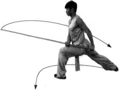 接上势,右脚向右侧踏步,右腿屈膝前弓,左 腿蹬直,成右弓步;身体右转;同时,两手握棍使 棍梢向身体右后斜方挂棍,两臂伸直;目视左前 方。(图 130、图 131)