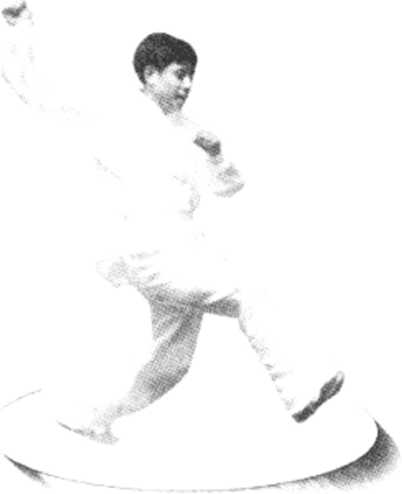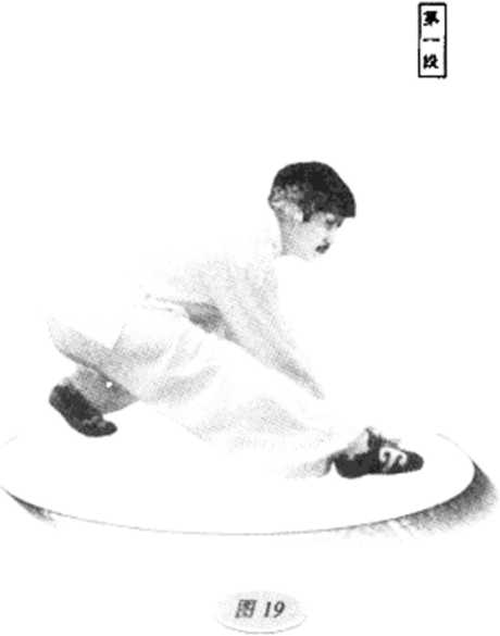 接上动作,右脚落地,两拳变掌向前伸臂,左手 扶地,头随身体前倾,含胸低头,右臂靠胸向后伸;同时,左手扶地右肩着地,左脚向上掀起,身体屈圆抱紧。由右肩背 经腰至左臀部滚翻一周,后变成右仆步,两手在身前扶地; 目视右腿方向(图18、19)。20