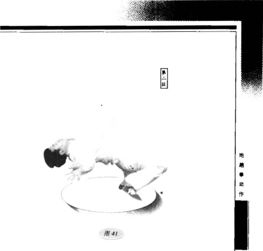 (2)腰臀上提肩背撑地,两腿分开向前弧形振摆,屈膝 收脚落于臀下(图40、41)。