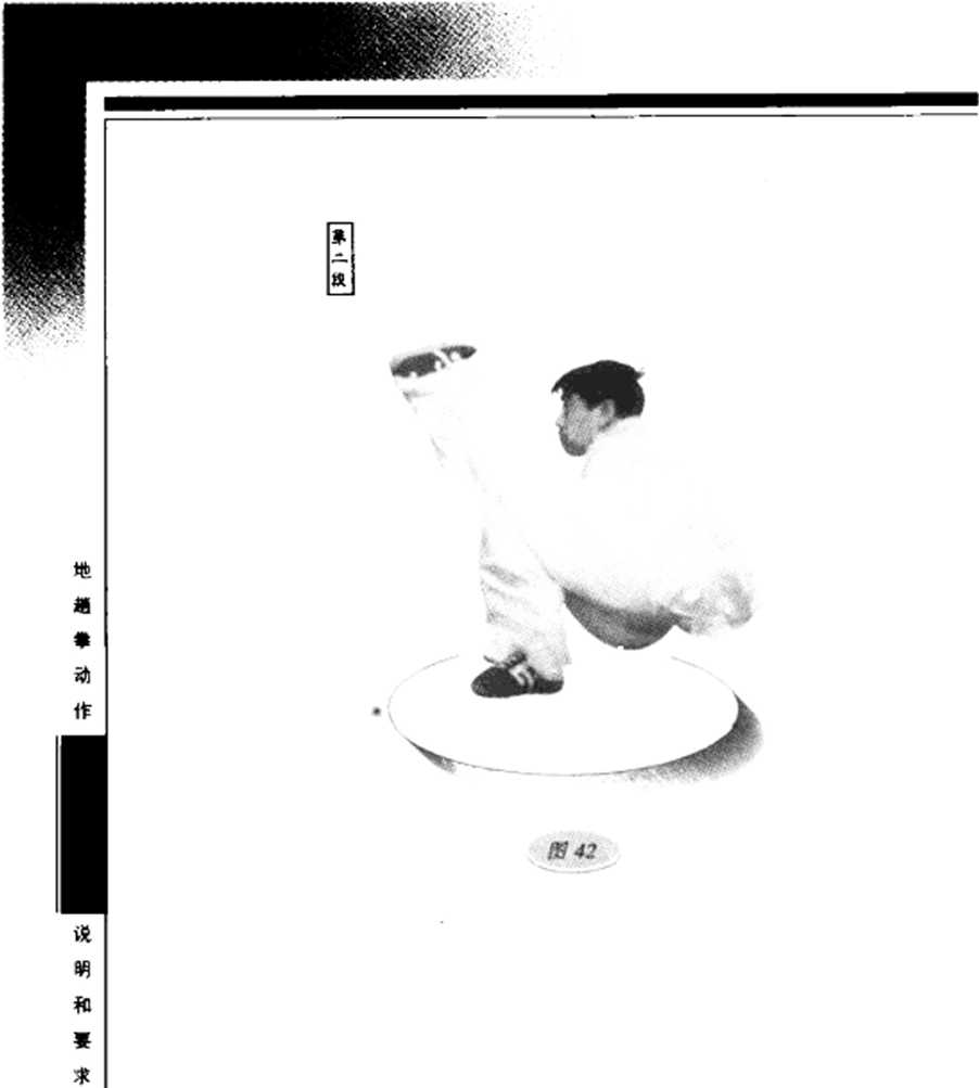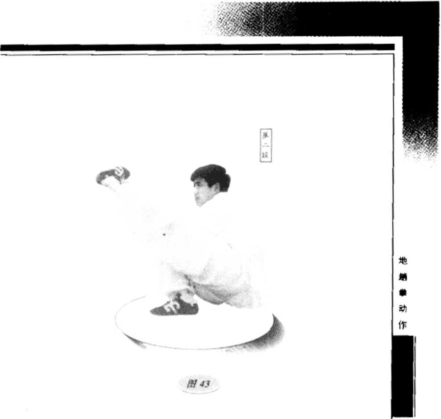 地面,与此同时,右脚尖外展向前上方戳出,高与膝齐;目 视右脚(图42)。