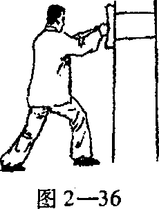 击打铁沙包练法:成左弓步或右弓步,面对沙包,用左拳或右拳直线向前击打沙包。(见图2—36)要点:先由轻至重,由慢至快进行,击打时要拳面接触 沙包,切忌翘腕,以免腕关节受伤。图 2—37