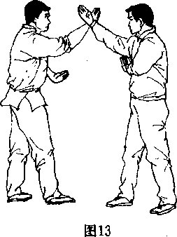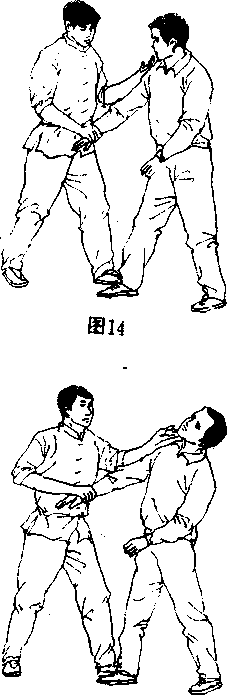 动作乙出右掌击甲甲出右掌接挡(图13)甲右掌翻腕外展拿住乙右腕顺势向下拉(图14)抬左臂用左掌四指戳入乙右腮窝,迫使乙就擒(图15)要点右手拿腕和左手戳腮双向用力要猛整个动作要迅速、连惯一气呵成。