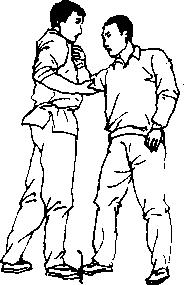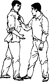 动作乙用右手击甲前胸甲用左手拿住乙右手或手指(图78)同时右手拿住乙右肘双手同时用力逆时针掰肘(图79)反乙右肩关节迫使乙就擒。要点甲含胸收腹左右手用力时不要让乙右肘伸直。图79