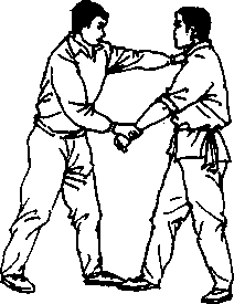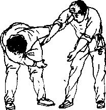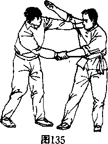 动作乙出左手搭住甲右肩出右手拿住甲左腕(图134)甲伸直右臂逆时针缠绕乙左小臂同时向右偏头,用头和肩夹住乙左手(图135)用右臂向下缠压乙左小臂反乙左腕和肘关节迫使乙就擒(图136)。要点口头和肩一定要夹紧乙左手右大臂缠绕幅度要大右臂尽量前伸下压迫使乙下蹲。