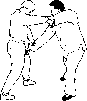 甲左手用抖力刁拿 乙右小臂。使乙方重心右 倾失重,当乙向左挣力 时。甲左手向右后带领。 甲左掌抹眉要向左下方 转腰。右手拿乙右腕抬 起。力点打在乙右足。