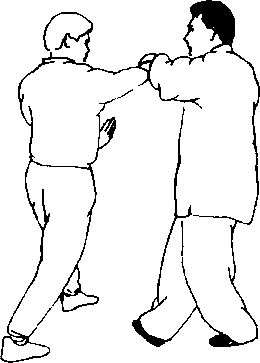 身体向右转,同时,甲左掌虎口朝里,经乙方右臂向 额部抹出,向左下侧画弧。甲方左脚随抹眉掌上步於乙