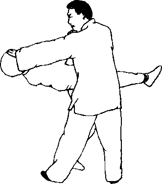 当乙方用左手推化甲右掌时,甲右掌顺势向左侧引 化。同时,左脚向前垫步,右脚向前上一步。甲右手接握 乙方右手腕,向右侧画弧翻腕,与右肩同高(图32- 151)。