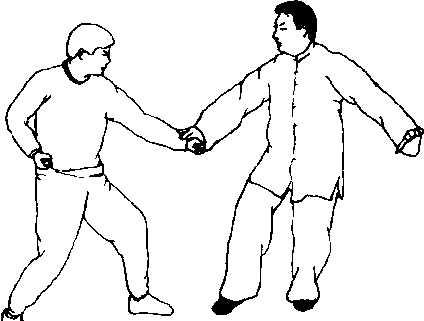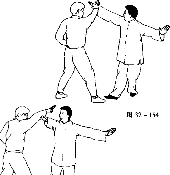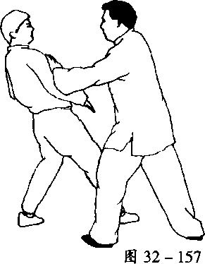 当乙方向后撤步,掣右臂的同时,甲方左脚上步,右 脚随即跟步。同时,右手变掌,并用掌根击打甲左掌心, 两臂成圆形,两肩下坠向前送两臂。头向上顶,甲方身体 正面对乙方身体右侧,以正打斜(图32-157)。