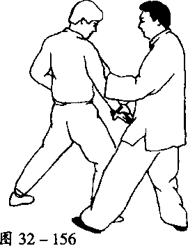 ~甲左脚上步,左掌由下向前画弧,四指并拢,虎口撑 开,掌心朝上,并用掌背挤压乙右大臂,随右手捋带而下 滑(图 32-156)。