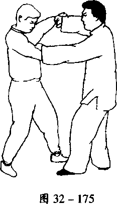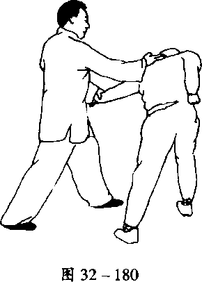 当乙方撤出右腿和右臂,并用左手拦截甲方左切掌 时,甲方迅速收左腿,并向左转身,左脚随即向左前方落 步,脚尖朝左前方向。左掌同时变招,手腕下垂,左手向 下绕乙方左手腕画一立圆,拿住乙手腕,并借乙左手拦截 之势向左下方猛带。甲右掌由后向前抡劈乙方左肩井 穴。同时,右脚向前上步,左脚跟步,腰胯下坐,右膀前探 <此招为”追命三式”,不可轻易用。>(图32-179、图 32-180)。