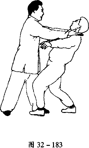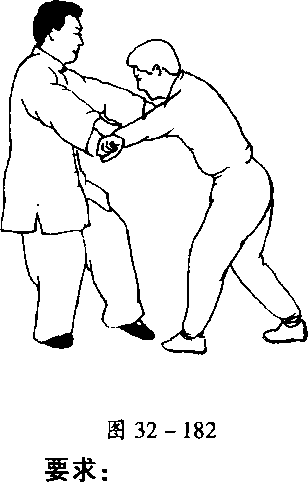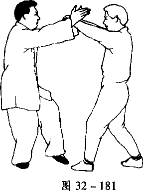 后方猛翻腕用抖带力。要坐胯沉肩,头向上顶。甲方左右 两掌分别在乙两肩上部,四指并拢,拇指内扣,两掌心相 对,掌外沿朝前(图32-181)。