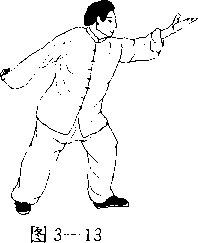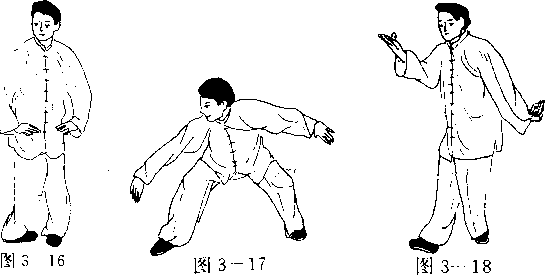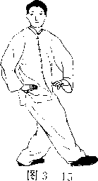 吸右胯、外掰右脚与左脚平行,呈“工”形,同时右掖掌由 下向左上方划半圈成仰掌,力在右掌外沿(即食、拇指侧),手 掌高与肩平,右臂弯曲,右肘下沉,两目顺右掌中指平视前方 (图 3—18)。