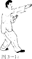 右脚尖外摆沿圈线向前(兑位)直进一步,成侧丁八步,腰 下坐。借右进步之势,右手向前掖掌,掌指朝下,掌心朝前,高 与膝平,上体略前探,目视右手,头向上顶;左掌同时向身后扒 劲,掌心斜向身后,虎口圆挣与左环跳穴相对。十趾抓地脚心 空,脚跟下委,重心偏于左脚,成三七步(图3—17)。