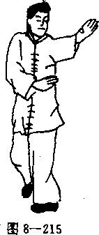 身体右转,右脚外掰,同时右掌由下向右前方 撩起,左脚向右前膛出一步,脚尖微扣。左掌随左膛步经右肘 下向前穿出,五指并拢,拇指内扣;右掌回拉于左腋下(图8 — 215)。