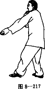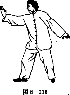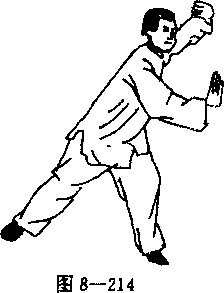 14 .上动不停,左脚后撤半步,左拳变掌并下翻(图8 — 223)。