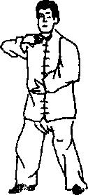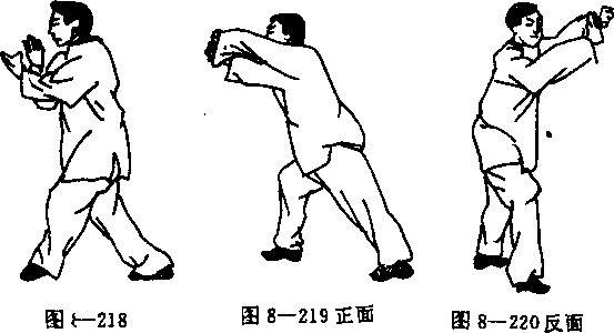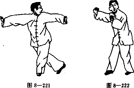 13 ,承上式,右脚经左脚后跟向前上步,同时,左掌变拳 由下向上经口前钻出;右掌由右后向胸前横捋并护于左肘(图 8—222),