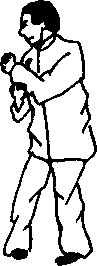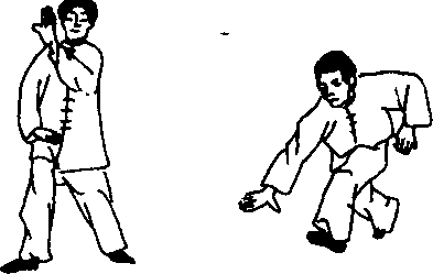 16 .承上式,左掌由下向内翻起,握拳顺嘴 前钻出,同时扣右步(图8—225)「