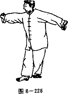 17 图 8—225图 8—225图 8 — 22t 图 8—227图 8 — 22t 图 8—227.承上式,身体右转?,右脚外掰,随掰步, 右拳变掌内翻,并由左向右横带,掌心朝下(图 8 — 226、图 8 — 227)。