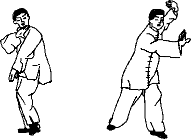 9 .承上式,吸左胯于右脚内侧,脚尖虚点地,同时左掌 内合掩肘,身体向右转,接着上左步,左掌顺势由下向上撩出, 四指并拢,虎口朝上(图8 — 247、图8 — 248)。