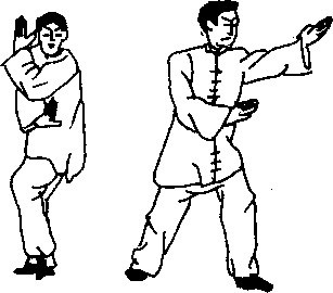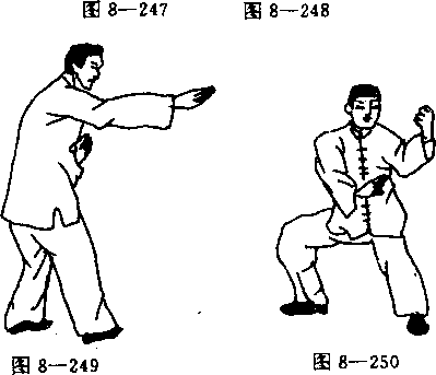 10 .承上式,右脚向前上一步并扣于左脚前成丁字步J右 掌同时经左肘下向前穿出;左掌回拉于右腋下(图8 — 249)。