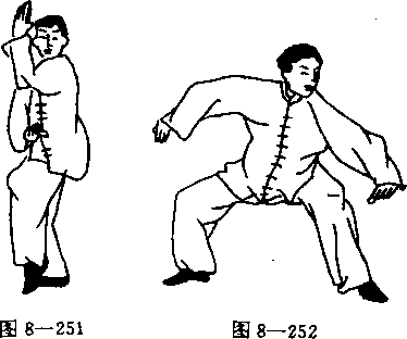 左脚向左前方进一大步,右脚跟步,同时借身 体左转之势,左掌由下向上横挑起,掌心朝外,虎口朝下;右掌 经左肘下以立掌击出,目视右掌(图8 — 246)。