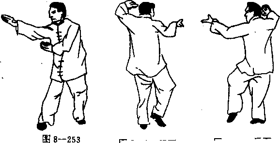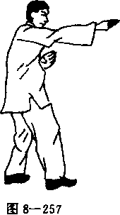 17 .承上式,掰左步同时左翻身,右掌内合,左掌顺势劈 出(图 8 — 258)。