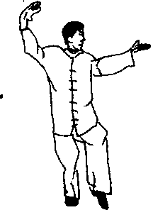 14 .承上式,左脚向左后掰进一步,右脚向左脚内侧前虚 点地.在两脚运动的同时,两掌同时由右下方向左上方托起, 成托枪式,目视右掌(图8 — 254正面、图8 —255反面)。