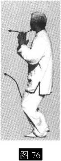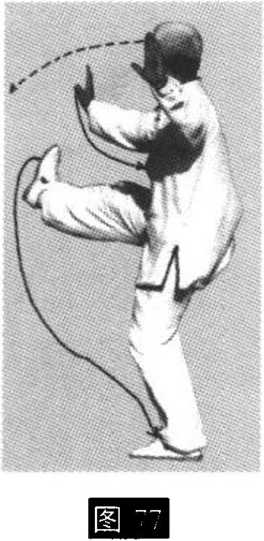 5 .起脚分掌:重心全部移至左腿并自然伸直,上 体微左转;同时,右腿伸直勾脚尖向右前(西北)、向上 踢起,腿与腰平;两掌向前、向左右侧前分举,掌心转向 外,指尖向上,腕与肩平;右掌臂与右腿上下相对;眼视 右掌(图77)(右起脚定势)。