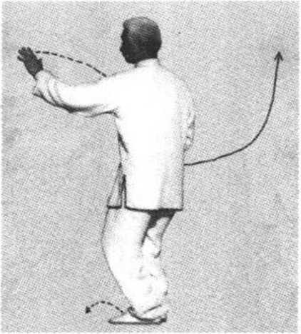 稳,上体端正;避免掀胯侧摆、弯腰、支撑脚跟上提。 ②胸前合掌时,立掌掌心相对,虚腋,肘外展,即掌合肘 开,所谓合中寓开;避免夹腋合肘。③意境:起脚时立如 栽桩。