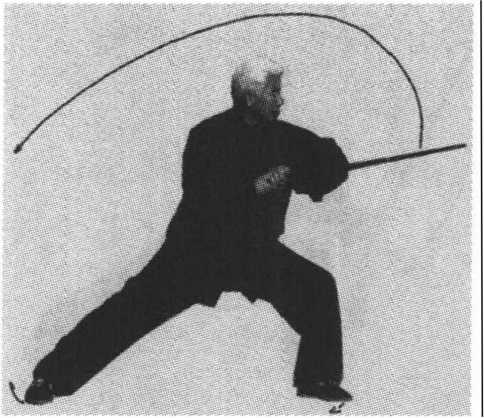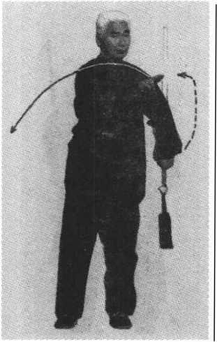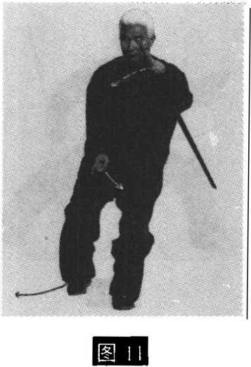 2 .转体举指:重心移向左腿,上体微左转;随之, 右臂向左、向上抬起,右手剑指高与肩平,指尖向前(东 南);左肘微屈外展,剑身直立仍平贴左前臂后侧;眼看 剑指方向(图9)。