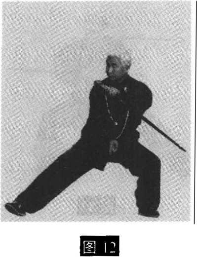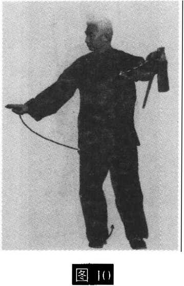 3 .持剑举臂:重心移向右腿,上体右转(胸向西 南);随之,右手剑指向右、向下划弧至腰高,手心斜向 下,右臂微屈成斜下举;左手持剑向左、向上、向右举至 肩平,手心斜向下,左臂微屈,剑身平贴左前臂下,剑尖 向后下方;眼随视右手剑指(图10) O