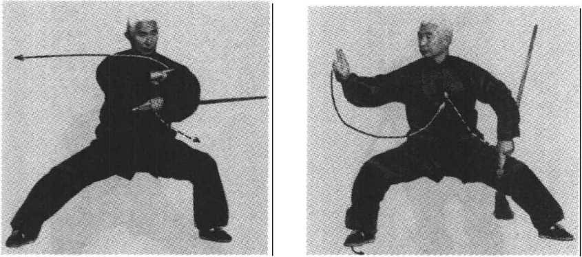 4 .马步持剑:重心慢慢右移,右脚踏实,两腿屈蹲 成马步,重心偏右腿(称右偏马步);右手剑指经左臂内 侧,向上经胸前横肘向右划弧至体右侧(偏前)垂肘立 指,指尖斜向上,同鼻高,手心向外;左手持剑屈肘内 旋,使剑立于左膝内侧上方,眼随视右手剑指(图13、 14) o