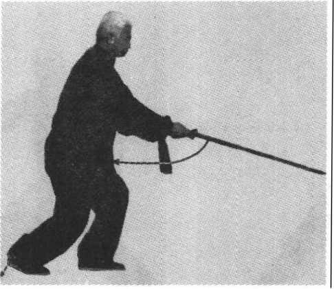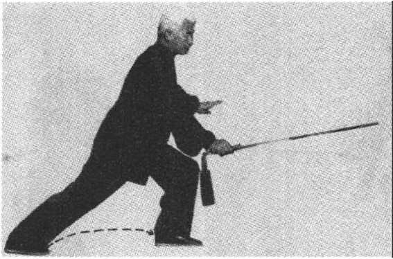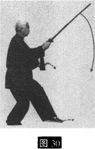 5 .转体穿刺:上体左转;随之,右手仰握剑伸臂, 使剑向左前下方(东北偏下)穿出,剑尖同膝高;左手剑 指仍附于右腕上;眼看剑尖方向(图29)。