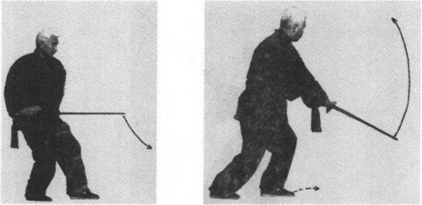 4 .转体带剑:重心移至右脚,右脚踏实;上体后坐 并右转,随转腰右手俯握剑。向右后领剑柄,使剑向右 平带;力点在剑身中部外侧刃,剑身与腹同高,剑尖稍 向左前下方;左手剑指仍附于右手腕内侧;眼看剑尖方 向(图28)。