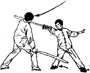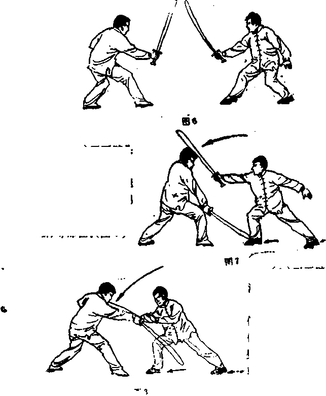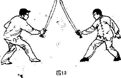 (1)正面劈头法甲方右左两腿依次向前进步同时劈向乙方的头司等部位(图7)(2)正面劈臂法甲方右左两腿依次向前进步,上体稍向右斜同时劈向乙方的肩施或头等部位(图8)