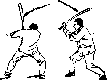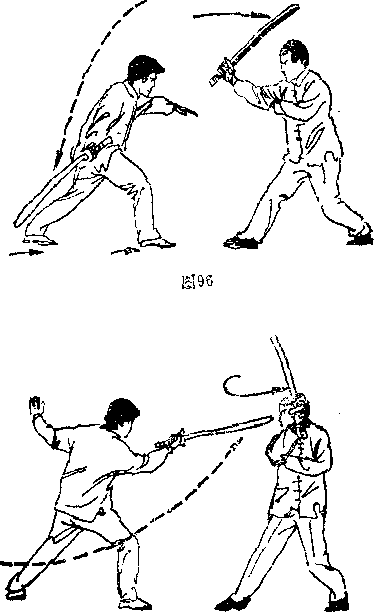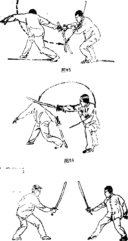 当乙方前腿上步,后腿插步同时反撩向甲方裆部时甲方后腿立即前上成半马步同时使兵器由上至下压挡住乙方之兵器并以左手护腕以抗击力即而抡劈向乙方的背部,(图92一9(3)防捺还点法预备势同前(图皎防正撩臂还反点头法当乙方前后两腮依次向前进步,同时正撩向甲方臂部时甲方上臂及身体立即后缩,并使得乙方兵器落空即成顺势反点向乙方的头部(图死一%)不98