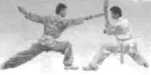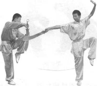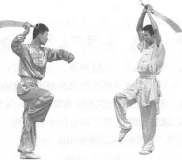2 .甲身体左转。右腿随转体伸直后独立支撑,左腿屈膝向上 抬起。右手握刀经右腰侧向前扎出,刀刃向下,刀尖向前;左手向 左、向上摆至头顶,掌心向上。目视乙。同时,乙重心前移。左腿 屈膝向上抬起,贴近胸部;右腿独立支撑。右手握刀推向身体右侧 格挡甲刀;左掌护于刀身。目视甲。(图6-42)