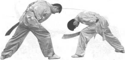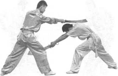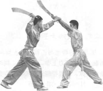 2.甲右脚经左脚落于身体后方,膝盖伸直;左腿屈膝,成弓 步。双手握刀由上向下、向乙劈刀。目视乙°同时,乙右脚落于身 体前方后屈膝,重心移至右腿;左膝伸直,脚后跟抬起。左手向前 上方挡甲手腕,将刀格于身体左侧外时右手握刀举于身体右上方。 目视甲。(图6-38)