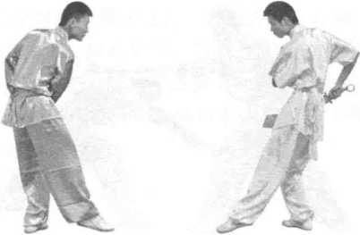 1.接上势,甲身体右转至与乙相对。左脚向右脚内侧并拢, 右腿屈膝向上抬起。双手握刀上举。目视乙。同时,乙上体抬起, 面向甲。左腿独立支撑,右腿屈膝向上抬起。左臂屈肘护于身前, 右手握刀举于身后。目视甲。(图6-37)