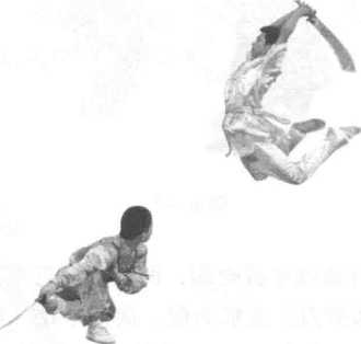 1 .接上势,甲在空中右手握刀向右后平扫,随即右手上举,