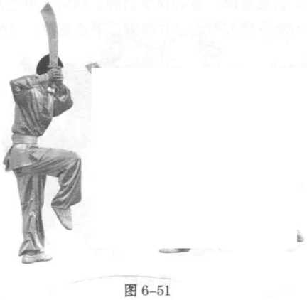 2 .甲双脚落地后,左腿屈膝,右膝伸直,成高弓步。双手握 刀上举由上向下劈刀。目视刀身。同时,乙快速起身,向右倾斜躲 避甲刀。左腿独立支撑,右腿屈膝向上抬起。双手握刀举于身体右 上侧。目视甲刀。(图6-50、图6-51)