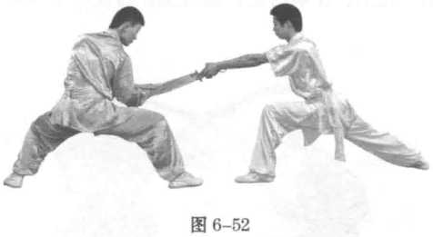 3 .甲延续上动惯性向下劈刀。同时,乙身体左转。右脚向前 方落步,双腿屈蹲成马步。双手握刀由右上向左下压甲刀,刀身呈 水平,刀刃向左,刀尖向前。目视甲刀。(图6-52)