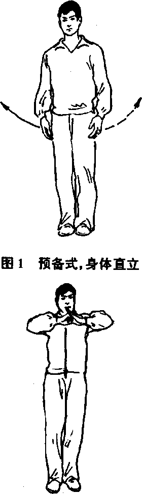 预备式:身体直立;两脚并拢,两脚尖外展成立正姿势,两 臂自然下垂,两掌停于两腿外侧,眼向前平视(图1)。
