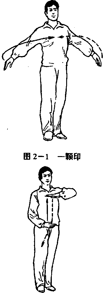 身体姿势不变,两掌由下经体侧向上向前作弧形摆动至 胸前时,臂内旋翻掌;同时右掌变拳,拳眼朝下,拳面向左,停 于胸前;左掌指朝上,拇指朝下,虎口扶于右拳面上;眼向前平 视(图 2-1,图 2—2)。