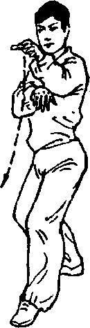右含机步(右虚步);同时,随身 体右转,左臂向下向右格挡,臂 停于腹前,左掌停于裆前,掌心 仍向下,右掌从下经胸前向上, 向左屈臂停于左肩前,眼向下看 左手(图4)。