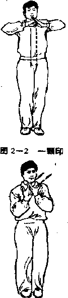 身体仍成直立姿势,两掌由下经体侧斜向上、向前成弧形摆动至胸前时臂内拖翻掌同时右掌变拳拳眼朝下拳面向左停于胸前左掌指朝上拇指朝下虎口扶于右拳面上眼平视前方(图2—工、图2—2