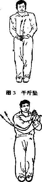 身阵姿势不变右拳左拳由胸前向下落至小腹前拳心