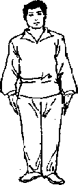 58-2印要求两臂成弧形摆动。收式、并步直立下肢不变右拳变掌两掌向下落至两腿外侧眼平视前76方(图59要求精神饱满,姿态优美图59收式并步直立